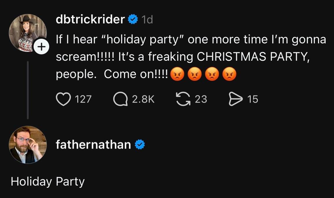 The original poster, “dbtrickrider” (who is almost certainly wearing that cowboy hat indoors), threatens to scream if she hears “holiday party” again. She demands it be called a “freaking CHRISTMAS PARTY.”
